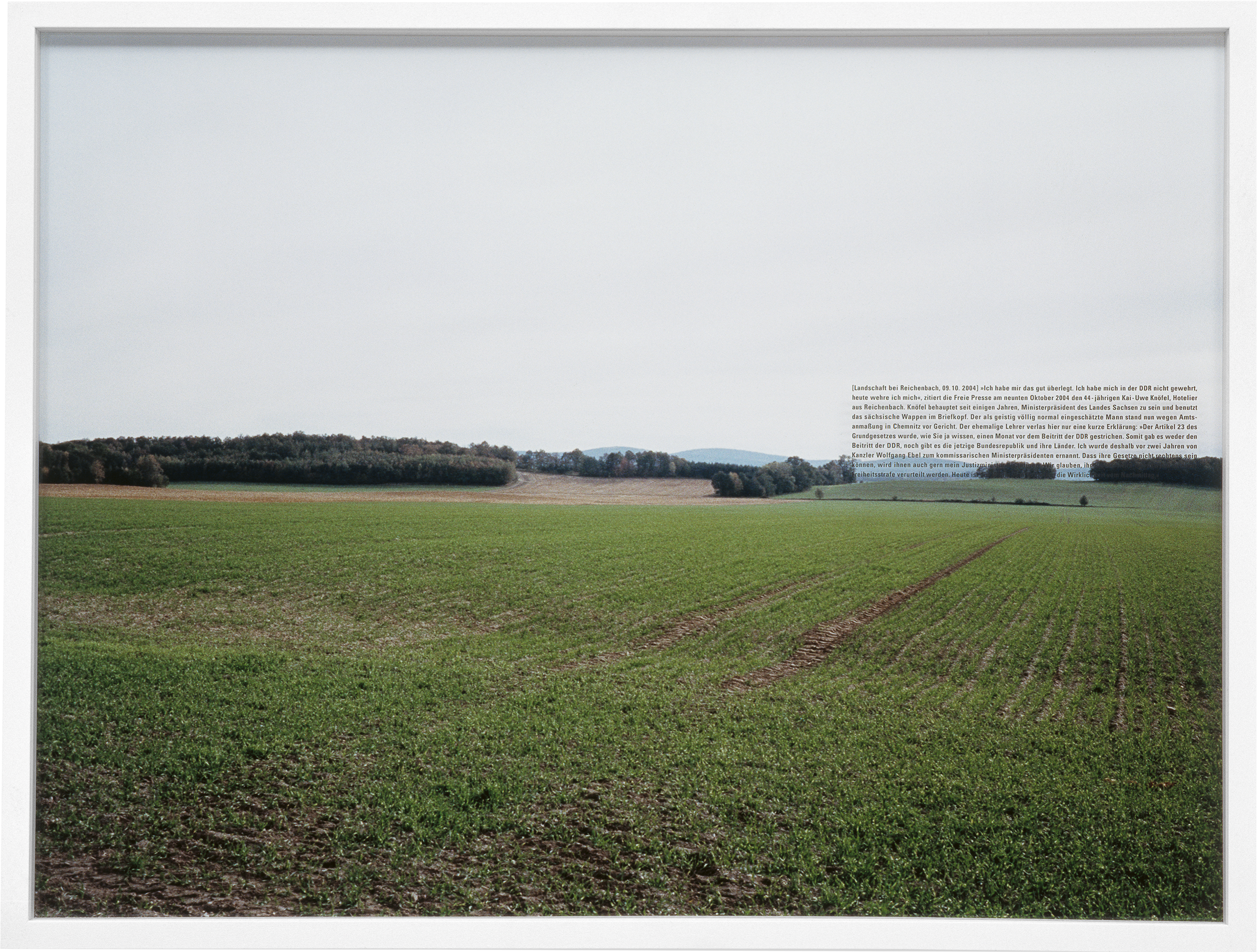 On October 9th, 2004, the Freie Presse quoted the 44-year-old hotelier Kai-Uwe Knöfel from Reichenbach, “I really thought about it a lot. In the GDR I never stood up for myself. Today I am.” For several years Knöfel has claimed to be President of the Free State of Saxony and uses the Saxon coat of arms in his letterhead. Charged with impersonating a federal authority, the otherwise normal seeming man was now on trial in Chemnitz. The former teacher read aloud a short statement: “Article 23 of the Constitution was annulled—as you will remember—one month before the reunification with East Germany. Therefore, there was no such thing as the reunification, nor does the present republic and its states exist. As a result, two years ago Chancellor Wolfgang Ebel appointed me Deputy President. My current Attorney General will confirm that your laws cannot be constitutional. We believe your judge will sooner or later be sentenced to prison. Today, the utopian ideals of the morning are the reality of the afternoon.”