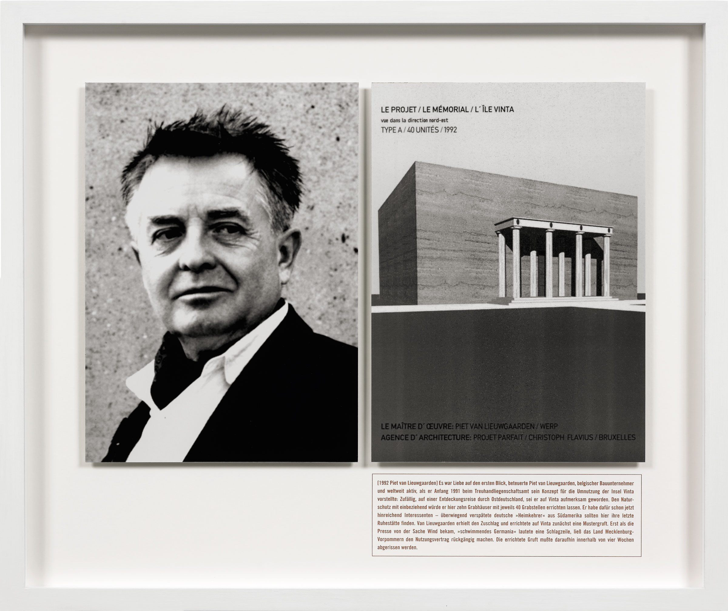 It was love at first sight, declared Piet van Lieuwgaarden, a Belgian building contractor with projects around the world, when he introduced his concept for the redevelopment of the island of Vinta to the Real Estate Trust Division at the beginning of 1991. By chance, while on an expedition through East Germany, he had come across Vinta. Here, and taking nature conservancy into account, he intended to erect ten mausoleums, each containing 40 burial sites. He already had ample potential customers: predominantly belated German “repatriates” from South America were to find their final resting place here. Van Lieuwgaarden's bid was accepted and he proceeded to build a model tomb on Vinta. It was only after the press got wind of the project—one headline called it Floating Germania—that the State of Mecklenburg-Vorpommern backed out of the contract. The erected tomb had to be torn down again within four weeks.