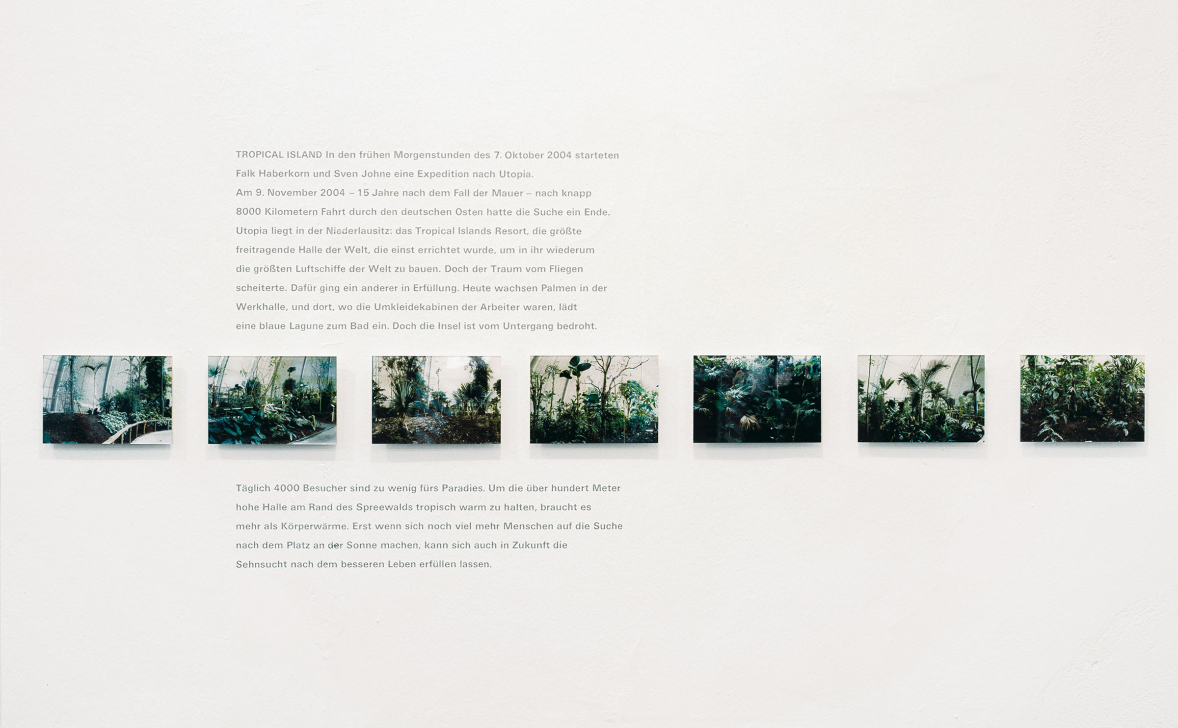 In the early morning hours of October 7th, 2004, Falk Haberkorn and Sven Johne started their expedition to find utopia. On November 9th, 2004—15 years after the fall of the Berlin wall—after driving almost 8000 kilometers through Eastern Germany, their search came to an end. Utopia is in Niederlausitz: the Tropical Islands resort.